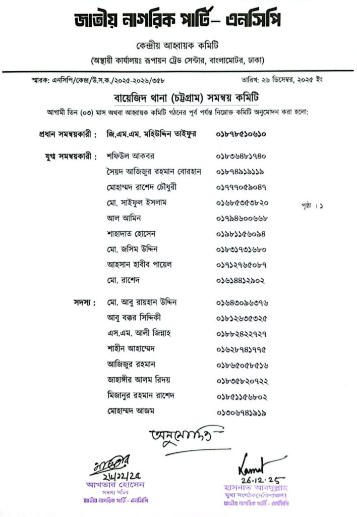 এই কমিটি অনুমোদন দিয়েছেন জাতীয় নাগরিক পার্টি এনসিপি’র কেন্দ্রীয় আহ্বায়ক কমিটির সদস্য সচিব আখতার হোসেন এবং যুগ্ম সমন্বয়কারী (চট্টগ্রাম) হাসানুজ্জামান।