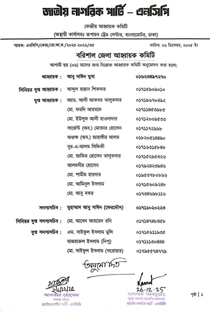 জাতীয় নাগরিক পার্টি (এনসিপি) সম্প্রতি বরিশাল জেলায় নতুন আহ্বায়ক কমিটি গঠন করেছে। কেন্দ্রীয় আহ্বায়ক কমিটির অনুমোদনের মাধ্যমে এই কমিটি আগামী ছয় মাসের জন্য কার্যকর থাকবে। স্থানীয় নেতৃত্বকে শক্তিশালী করা এবং জনগণের সাথে সরাসরি যোগাযোগ বাড়ানোই এই কমিটির মূল লক্ষ্য।